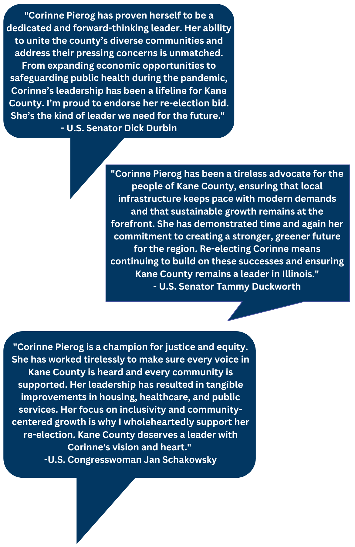 A coalition of Illinois’ top political leaders, including U.S. Senators Dick Durbin and Tammy Duckworth and U.S. Representative Jan Schakowsky, have come together to endorse Corinne Pierog in her re-election bid for Kane County Board Chair. Praising her leadership, vision, and commitment to the residents of Kane County, the leaders underscored the critical role Pierog has played in advancing the region’s economic, environmental, and public health goals.